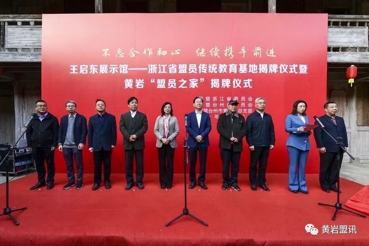 浙江省政协副秘书长、民盟省委会专职副主委徐燕峰,中共台州市委常委、统战部长单坚为“浙江省盟员传统教育基地”揭牌;台州市政协副主席、民盟市委会主委曹羽,中共台州市委统战部常务副部长徐友根为黄岩“盟员之家”揭牌;王启东先生家属代表王宇平,中共黄岩区委常委、统战部长潘禹斌为“王启东展示馆”揭牌。