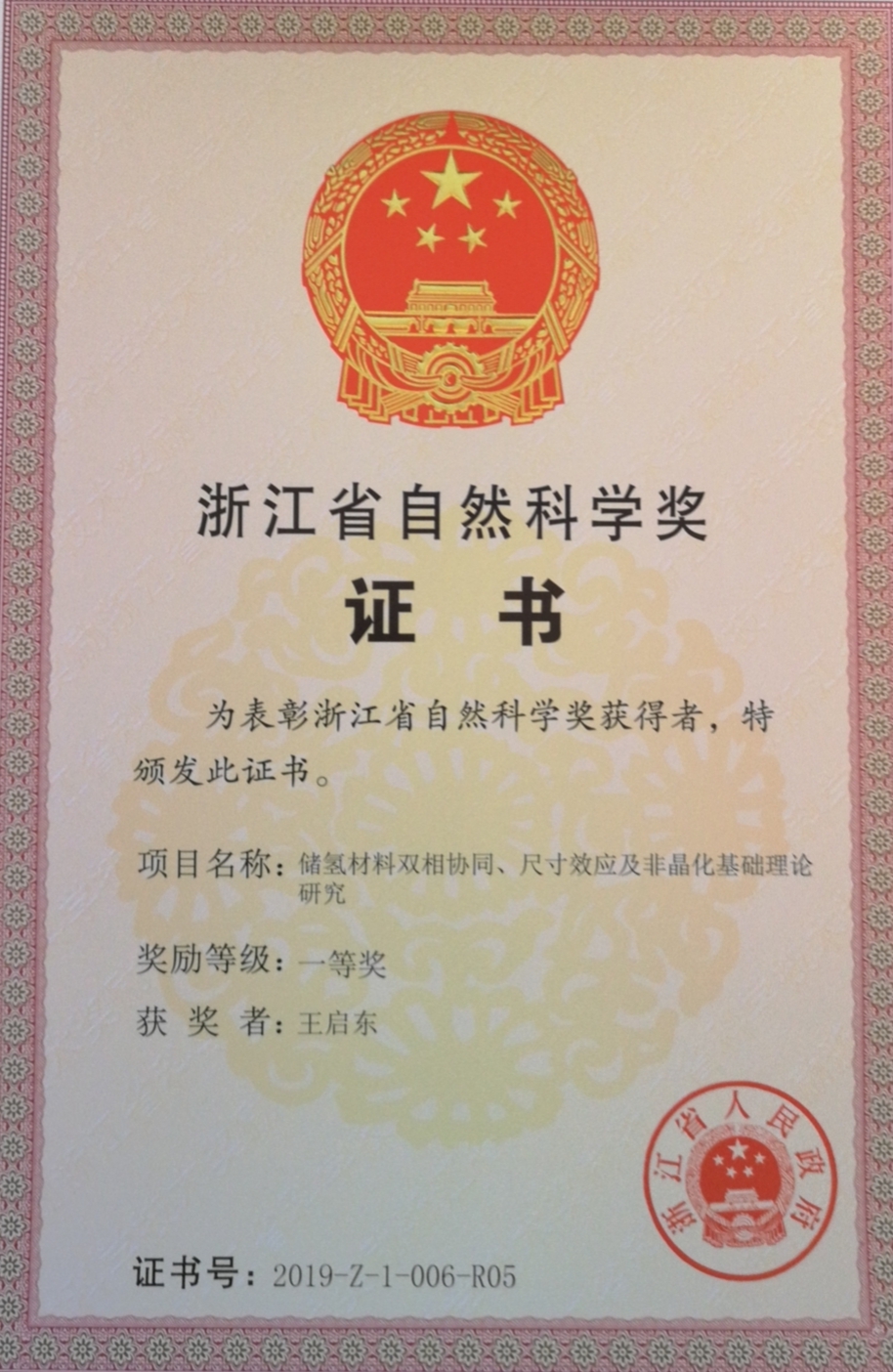 2019年浙江省自然科学奖一等奖