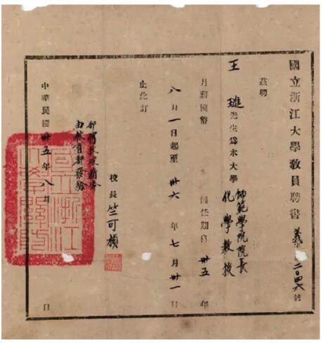 1934年,王琎再出国门,进入美国明尼苏达研究院任研究员,师从著名物理化学家、分析化学家科尔托夫(I.M.Kolthoff)继续深造。他十分珍惜难得的学习与研究机会,利用优越的实验条件,于1936年5月撰写了《铂、金、银在不同电解质溶液中的电极电位》论文,首次解释了铂、金、银在不同的电解质溶液中具有不同抗腐蚀能力的原因,并因此获得科学硕士学位。同年回国后,先接四川大学校长任鸿隽之聘,任该校教授。1937年,又受竺可桢校长之请到浙江大学任教,历任理学院化学系主任、师范学院院长兼理化系主任、理学院代院长等。王琎到浙江大学后不久,即随校西迁。他携师生与眷属,颠沛流离,历尽艰难。在川桂公路上,他遭遇了一次翻车之祸,险些丧命,不仅家产荡然无存,更遭遇了丧偶之痛。经受人生最残酷的打击,他却无怨无悔,真是令人肃然起敬。