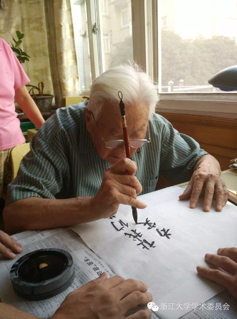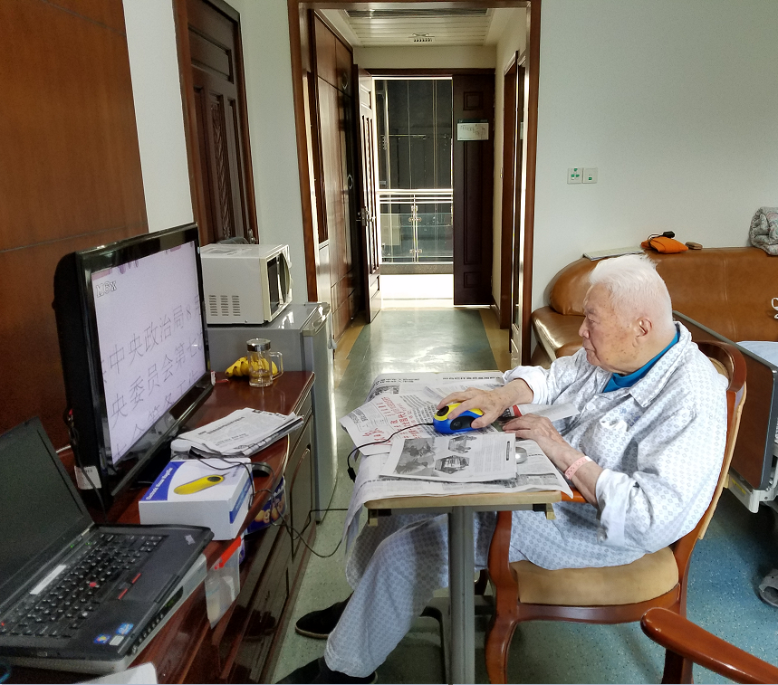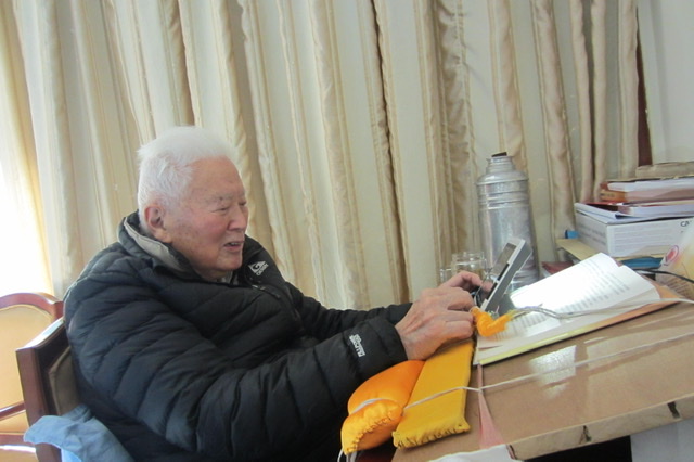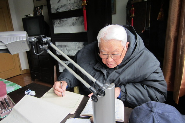 爸爸步入老年后, 患有眼疾, 医学名为《黄斑变性》。 视力不断的在退步,特别是在九十岁以后。 看报看书看资料很吃力了。 一开始我们给他买了3倍放大镜, 后来提高到10倍, 最后提到72倍。 即使这样, 他还是孜孜不倦的学习和研究。 每天都在和时间赛跑, 觉得时间不够用, 资料看不完。 常常有人来让他看论文, 改文稿和题字, 当儿女的我们都很不忍心让他去看去写。 因为他在写字上做的努力, 不是常人可以想象的。 他写的字常常会重叠在一起, 为此, 哥哥和姐姐常常要帮他把笔放到对的位置让他开始写。 即使这样爸爸还是很乐观, 很热心的帮助他人......