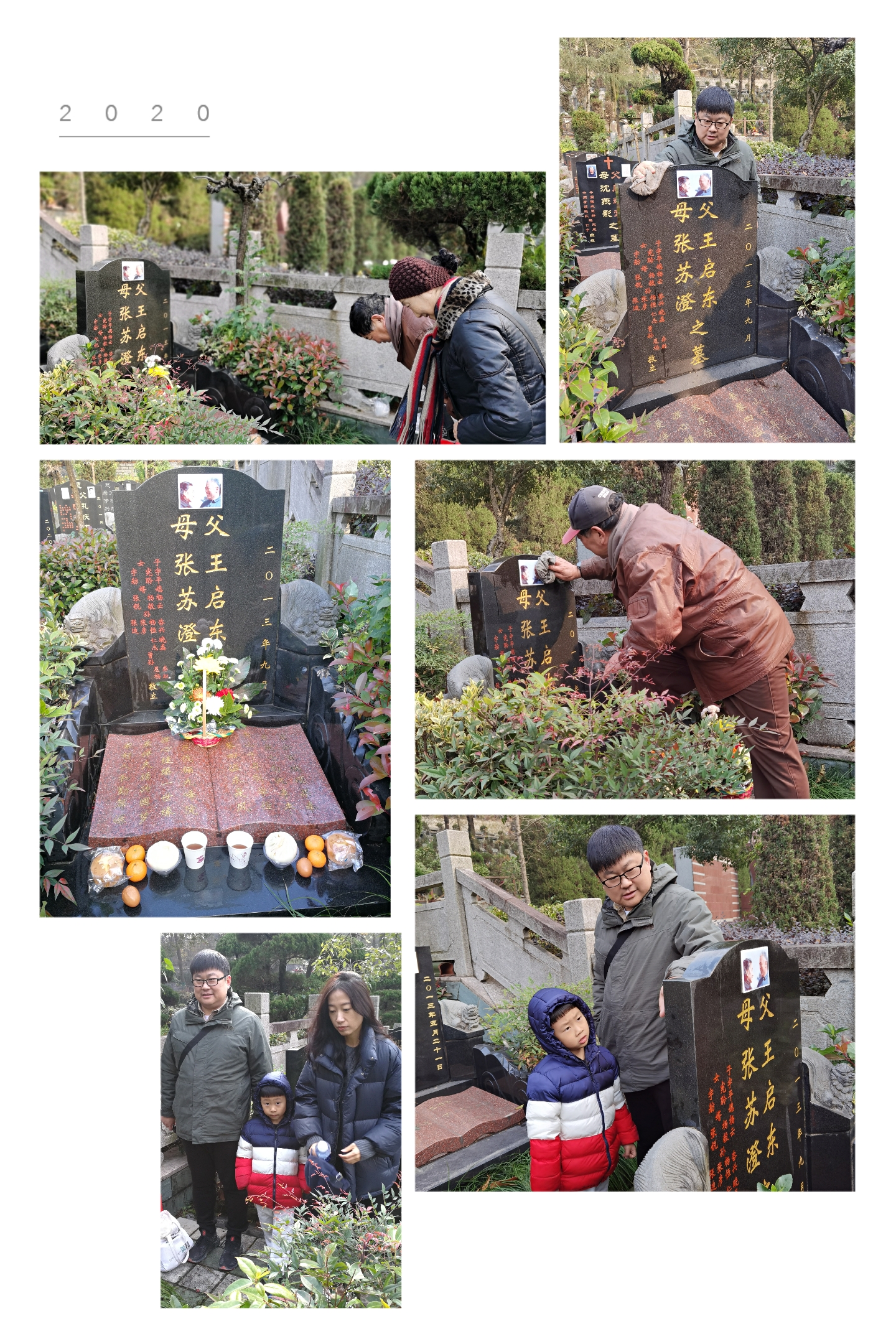 今天是周六,离冬至还有二天。为了能全家都去祭拜爸妈,我们一家五口今天去南山陵园,给爸妈扫墓。这几天杭州最冷,昨晚还在下雨夹雪。今天天气不错。替宪聆与小妹一家都鞠了躬。陵园里人很多,汽车只能停在虎玉路上。兜兜一路自己走,还不断的东问西问,使我想起来当年我们和爸妈一大家子背着兴兴从虎跑上山的情景。随后我们又去了杨云的父母亲的墓地。