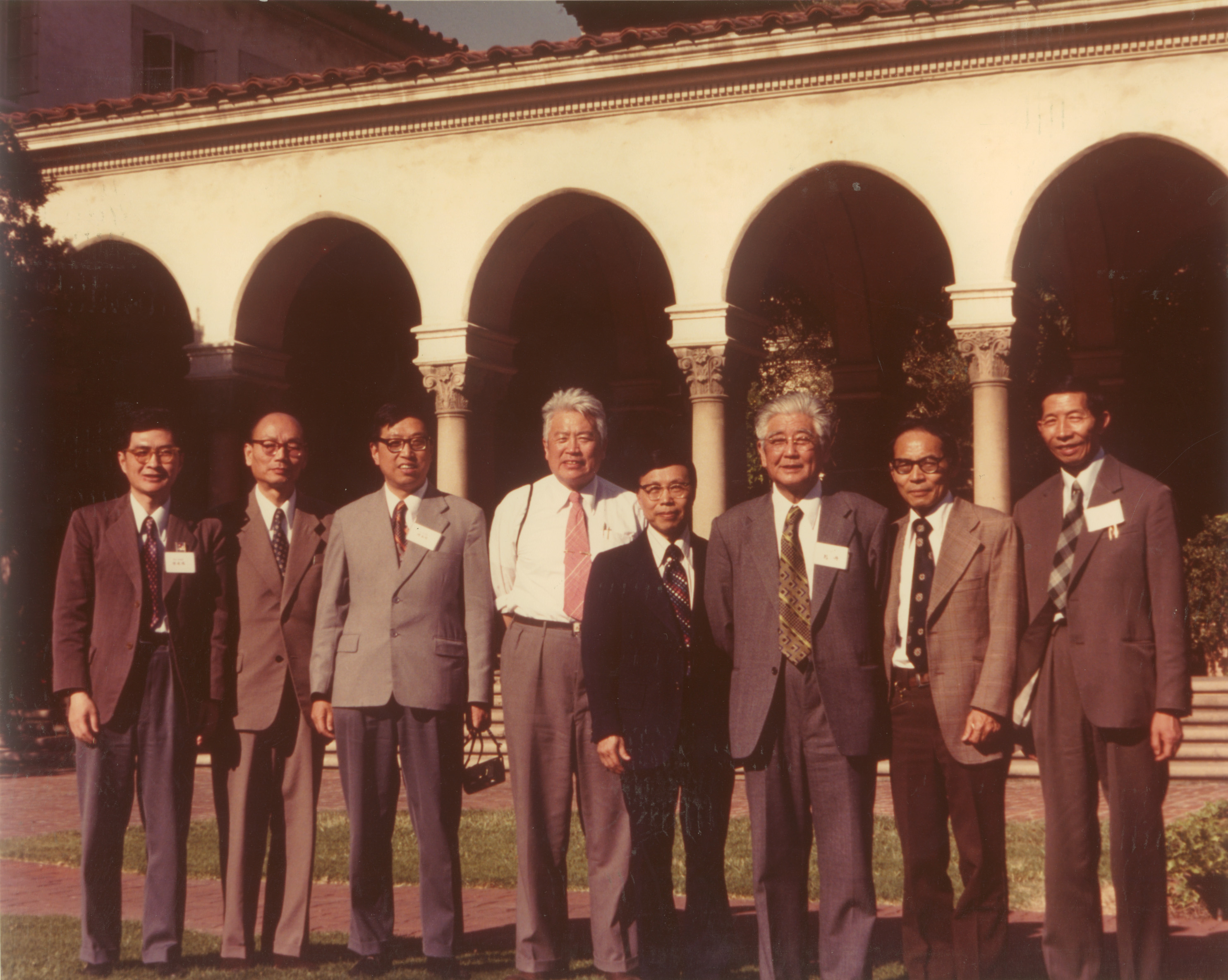 访美合影。从左至右为:缪进鸿,侯虞钧,何志均,王启东,在美校友,刘丹,陈哲人,李文铸。